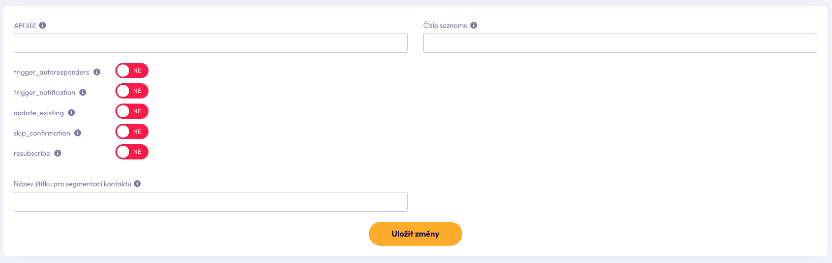 - trigger_autoresponders – Umožňuje spustenie automatizácií s triggerom „Prihlási sa do zoznamu“. Odporúčame dať „ÁNO“